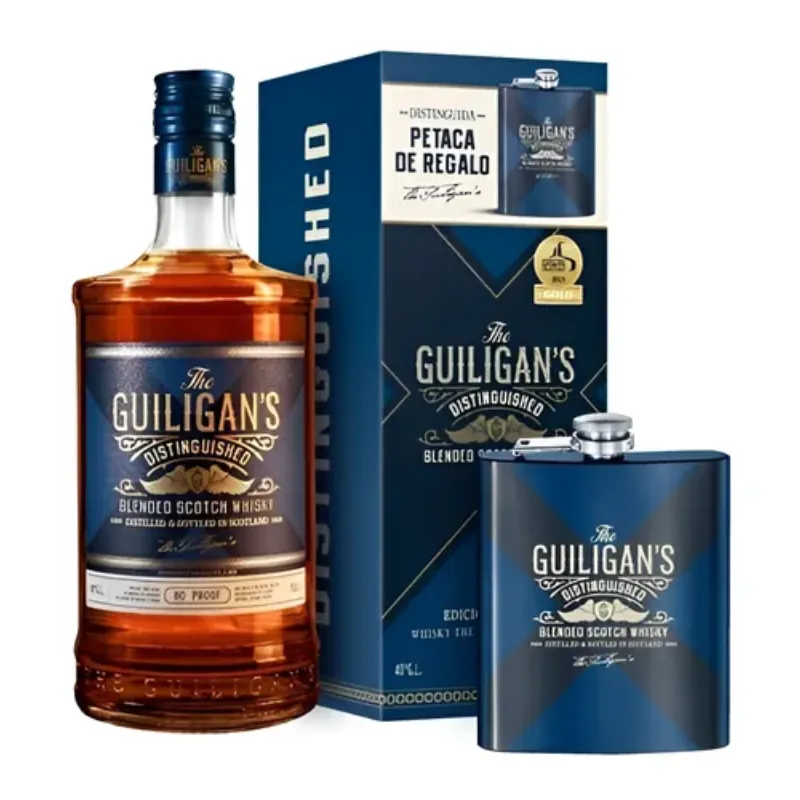 Pack que incluye un whisky the Guilligans 750 ml + petaca guilligans, es un whisky escocés suave y equilibrado, con notas de frutos secos, vainilla, caramelo y especias, y un final fresco. Su sabor se produce al ser añejado en antiguas barricas de bourbon, lo que lo hace ideal para tomar solo, con hielo o en cócteles. Tiene una graduación alcohólica de 40%.